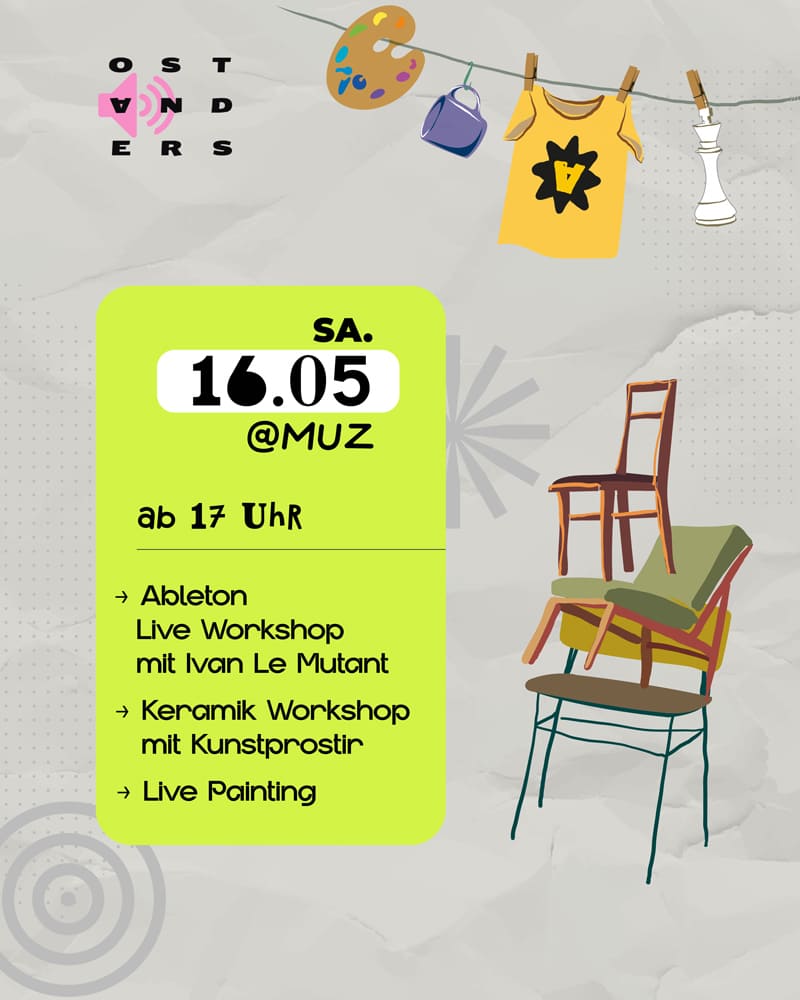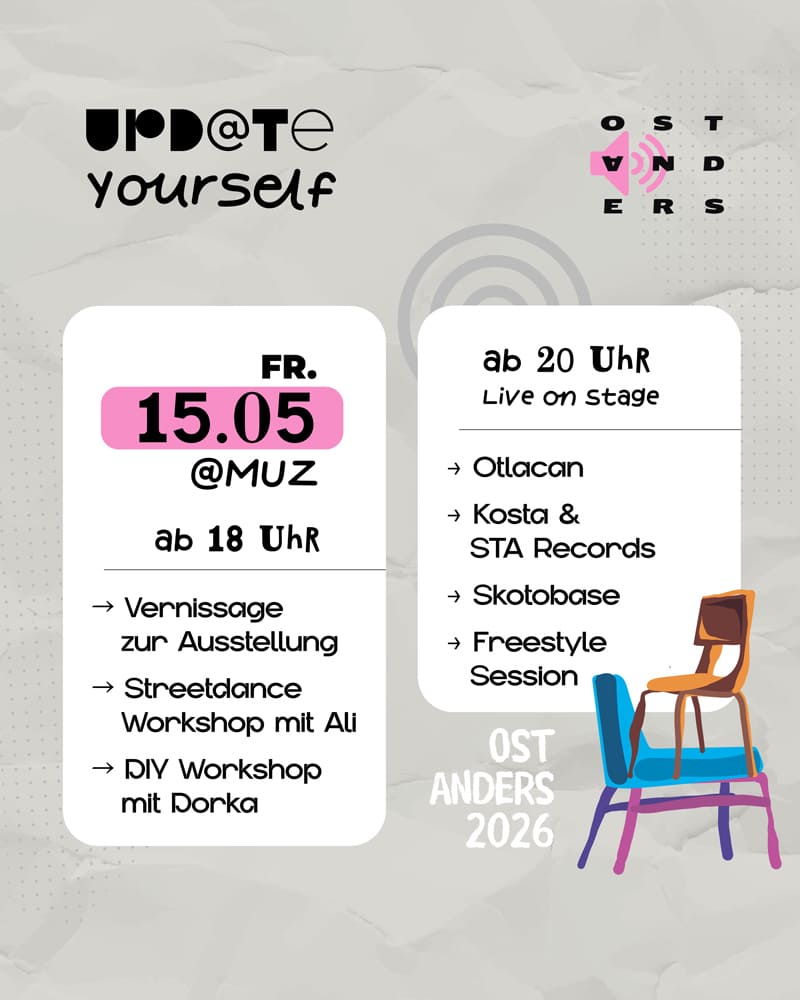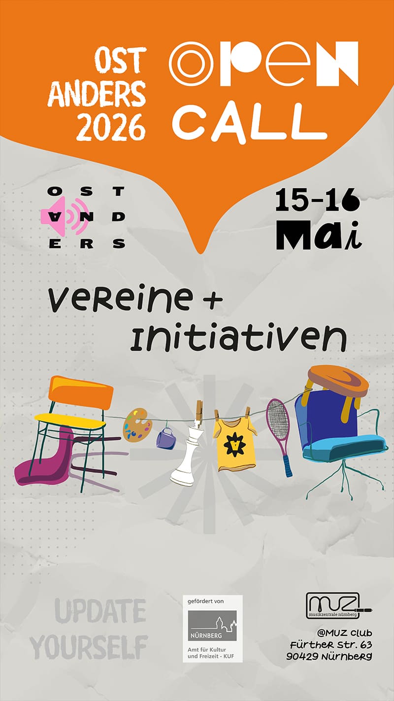 Früher als „postmigrantisch“ bezeichnet, wollen wir uns 2026 ganz klar im HIER und JETZT wiederfinden. Wir suchen nach Vereinen, Initiativen und anderen Projekten, die sich mit Beteiligung von Migranten und Migrantinnen in Nürnberg gegründet wurden und gewachsen sind. Ob Sportvereine, StartUps, Kunstschulen oder Spielcommunitys – alles was euch geholfen hat, sich in Deutschland UpZuDaten und besser integriert zu fühlen, anstatt in der eigenen Bubble zu bleiben. Schickt uns eine kurze Vorstellung bis zum 20.März auf info@ostanders.de und werde evtl. ein Teil von diesjährigem Ost Anders!